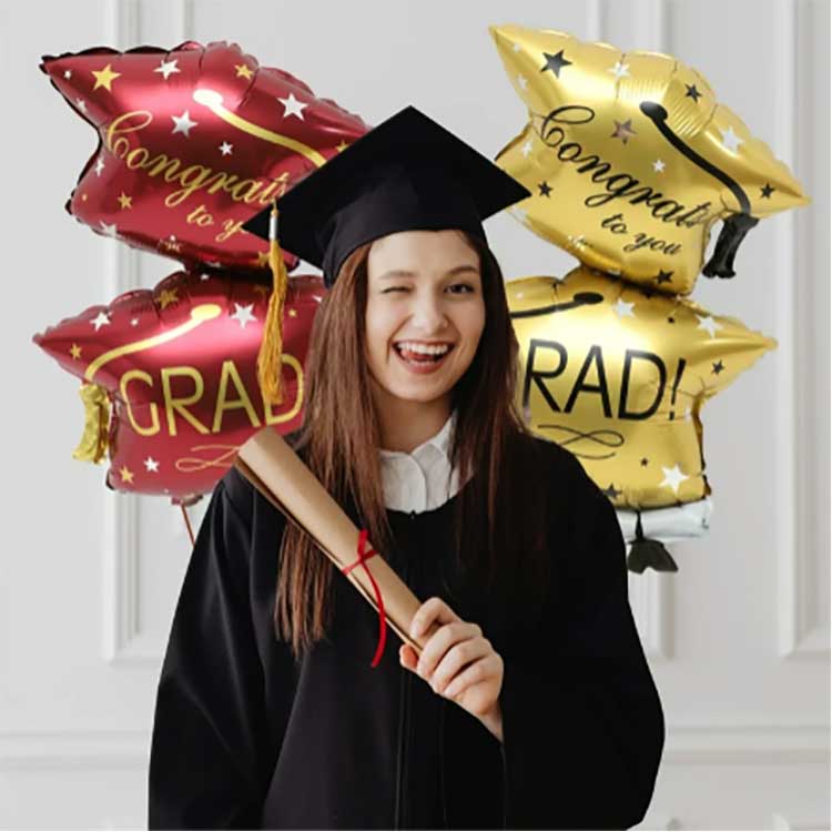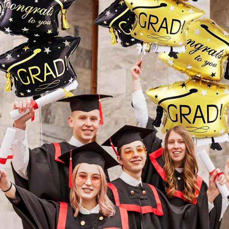 Nasz zestaw balonów z czapką 32-calową wykonany jest z wysokiej jakości aluminiowanej folii PET o grubości 18 mikronów. Folia ta charakteryzuje się doskonałą elastycznością, nadmuchuje się całkowicie i puszystie oraz jest odporna na ściskanie i uderzenia — idealna do szkół i podobnych obiektów. Do druku używamy farb przyjaznych dla środowiska, dzięki czemu uzyskujemy żywe, równe kolory i odporne na blaknięcie. Nawet po wielu godzinach ekspozycji na bezpośrednie działanie promieni słonecznych, np. podczas ceremonii ukończenia szkoły na świeżym powietrzu, wzory i kolory pozostają tak żywe jak zawsze.