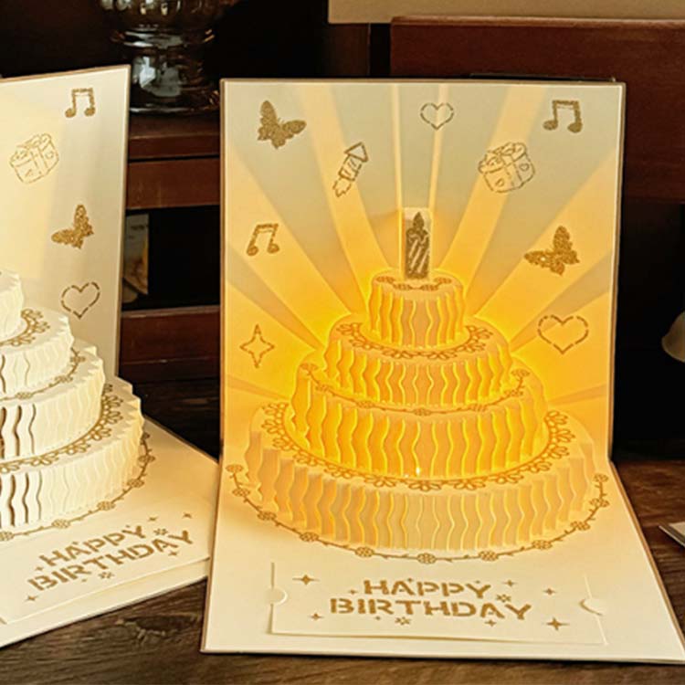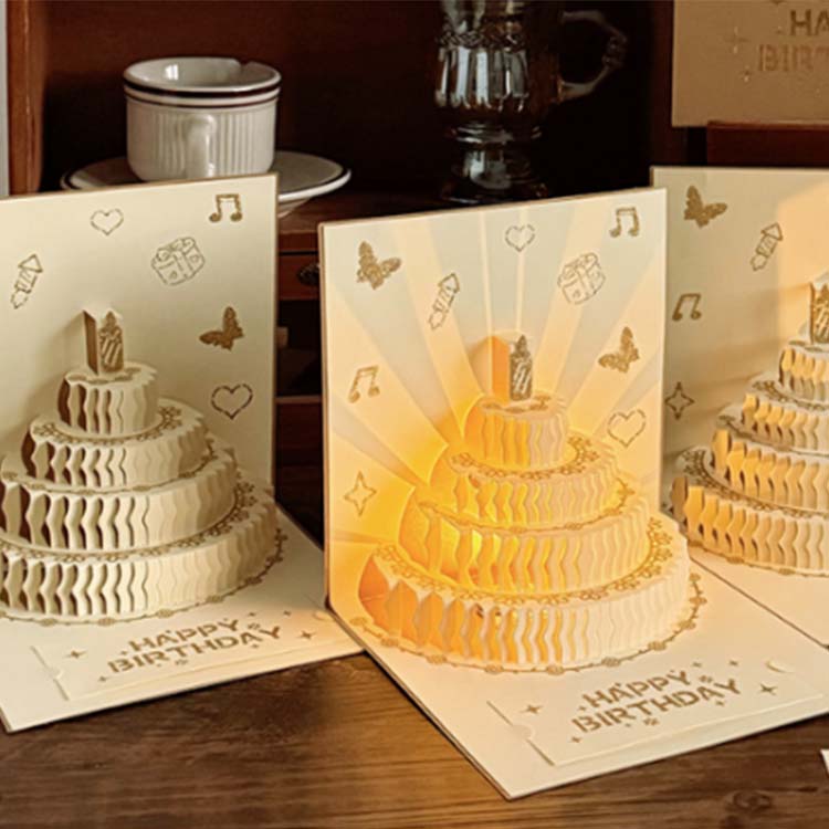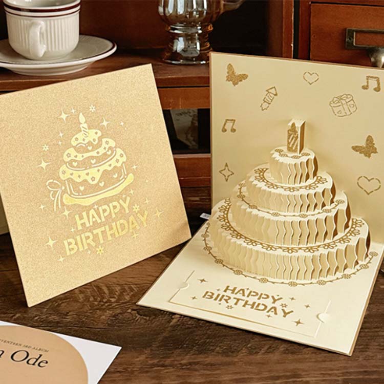 Okładka karty urodzinowej 3D jest wykonana z kolorowego procesu wytłaczania. Jego wnętrze ma konstrukcję 4-warstwowego ciasta, a do gratulującej wiadomości dodaje się małą kartkę z życzeniami.