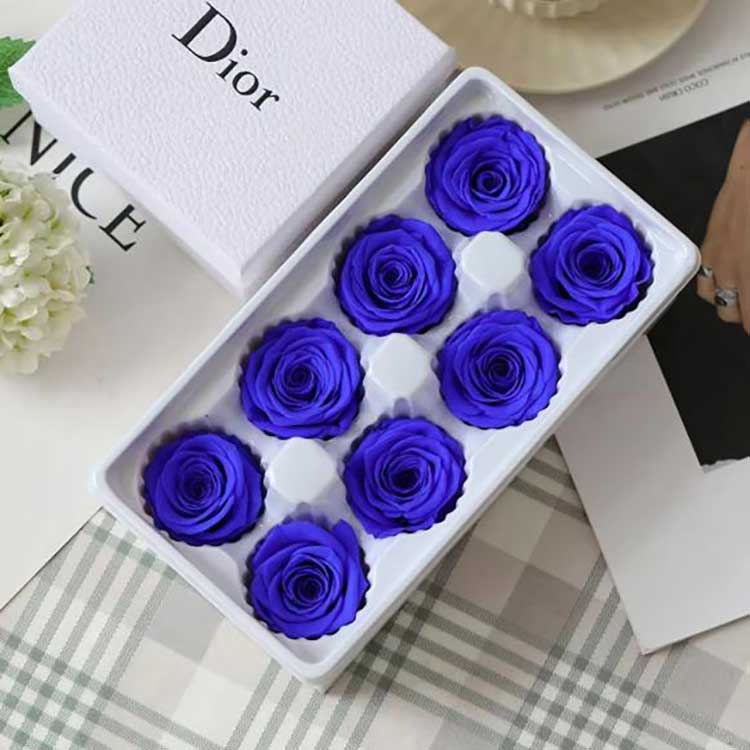 Róże dzieli się na trzy poziomy: A, B i C. Róże klasy A są większe i pełniejsze. Nasze pudełko upominkowe Everstanding Flower 8 kwiatów wykonane jest z róż klasy A. Wymiary pudełka upominkowego to 24 cm * 13 cm * 8 cm. Każde pudełko waży około 150g. Okres trwałości zakonserwowanych kwiatów: 3-5 lat w normalnych warunkach przechowywania, co jest korzystniejsze dla sprzedaży.
