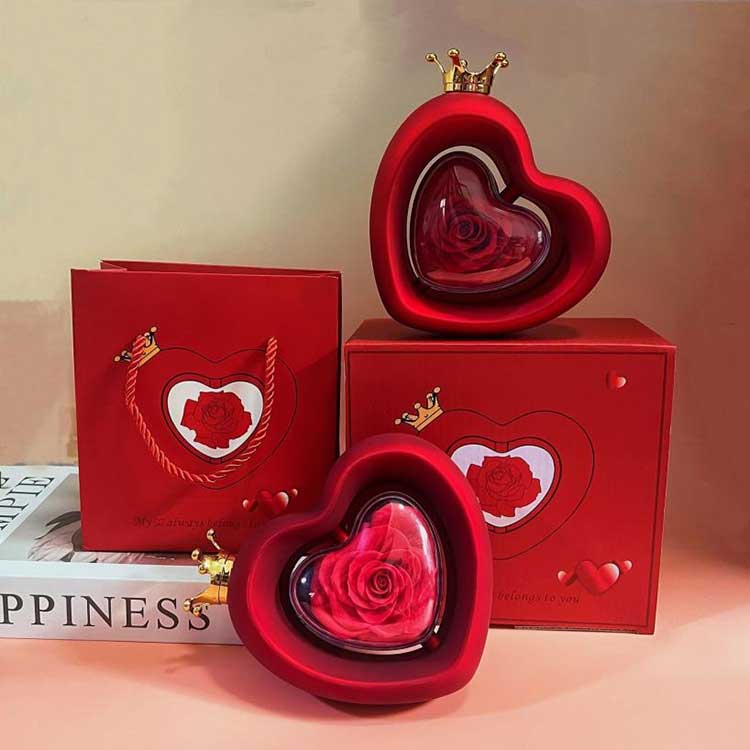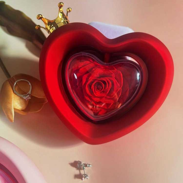 Pudełko na biżuterię w kształcie serca w kształcie serca wykorzystuje zakonserwowane kwiaty klasy A, których kolor i faktura są nie do odróżnienia od świeżych kwiatów.